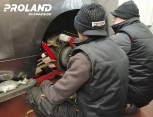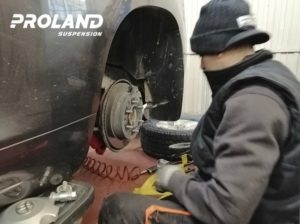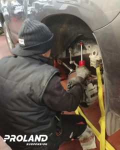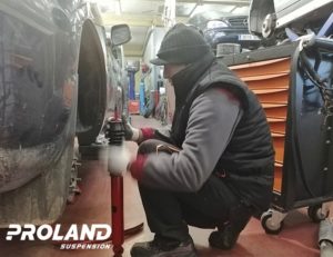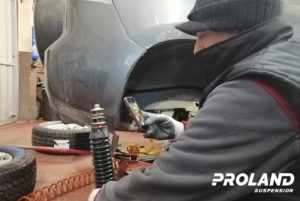 - Se mide diferencia de altura entre el eje delantero y el trasero, para comprobar el estado de los muelles. Si de la comprobación se deduce que están cedidos los muelles delanteros, entonces hay que proceder a la selección y colocación del anillo adecuado a la altura que nos ha dado la medición. Estos anillos van incluidos en KIT de los amortiguadores.